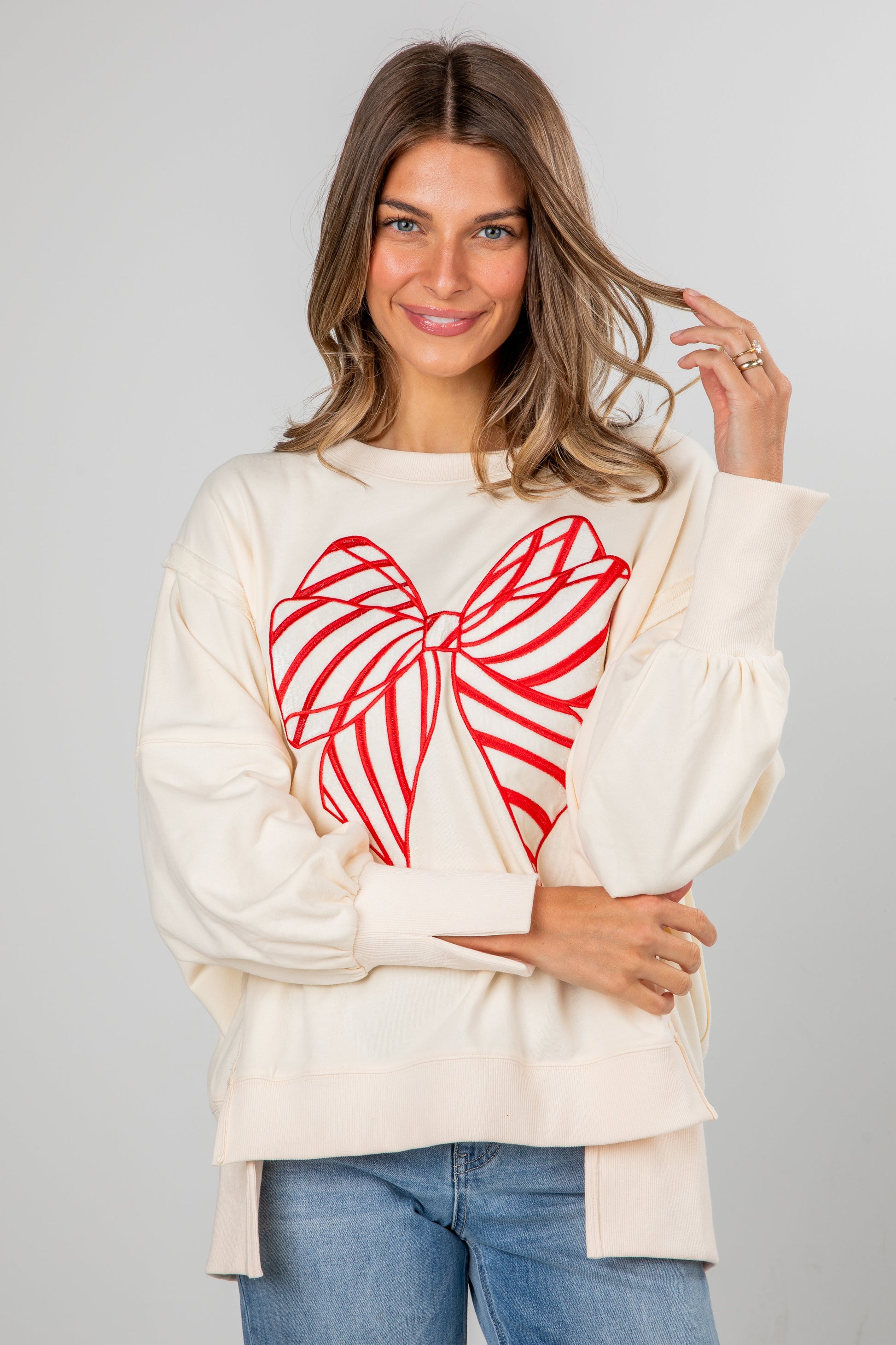 Sweet, classic, and perfectly festive — the Ivory Peppermint Bow Pullover adds a charming holiday touch to your cozy-season wardrobe! The standout detail is the beautifully embroidered bow on the front, stitched in cheerful red peppermint stripes for a playful, candy-inspired look. Crafted from a soft, warm knit with a relaxed fit, this pullover feels just as good as it looks. Pair it with jeans, skirts, or festive accessories for an effortlessly cute holiday outfit. Cozy, whimsical, and wonderfully merry — it’s the perfect sweater for celebrating the season in style!